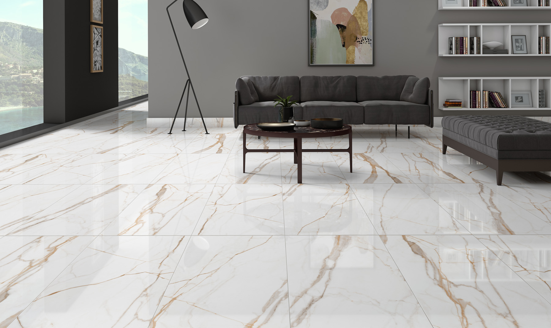 Classic marble meets modern resiliency. Calacatta Oro is a marble-look porcelain tile—white base with bold gold veining. It captures that timeless elegance without the upkeep pain of real marble. (Fun fact: many suppliers market a “Calacatta Oro 24×48 Polished Porcelain” as a premium marble alternative.)