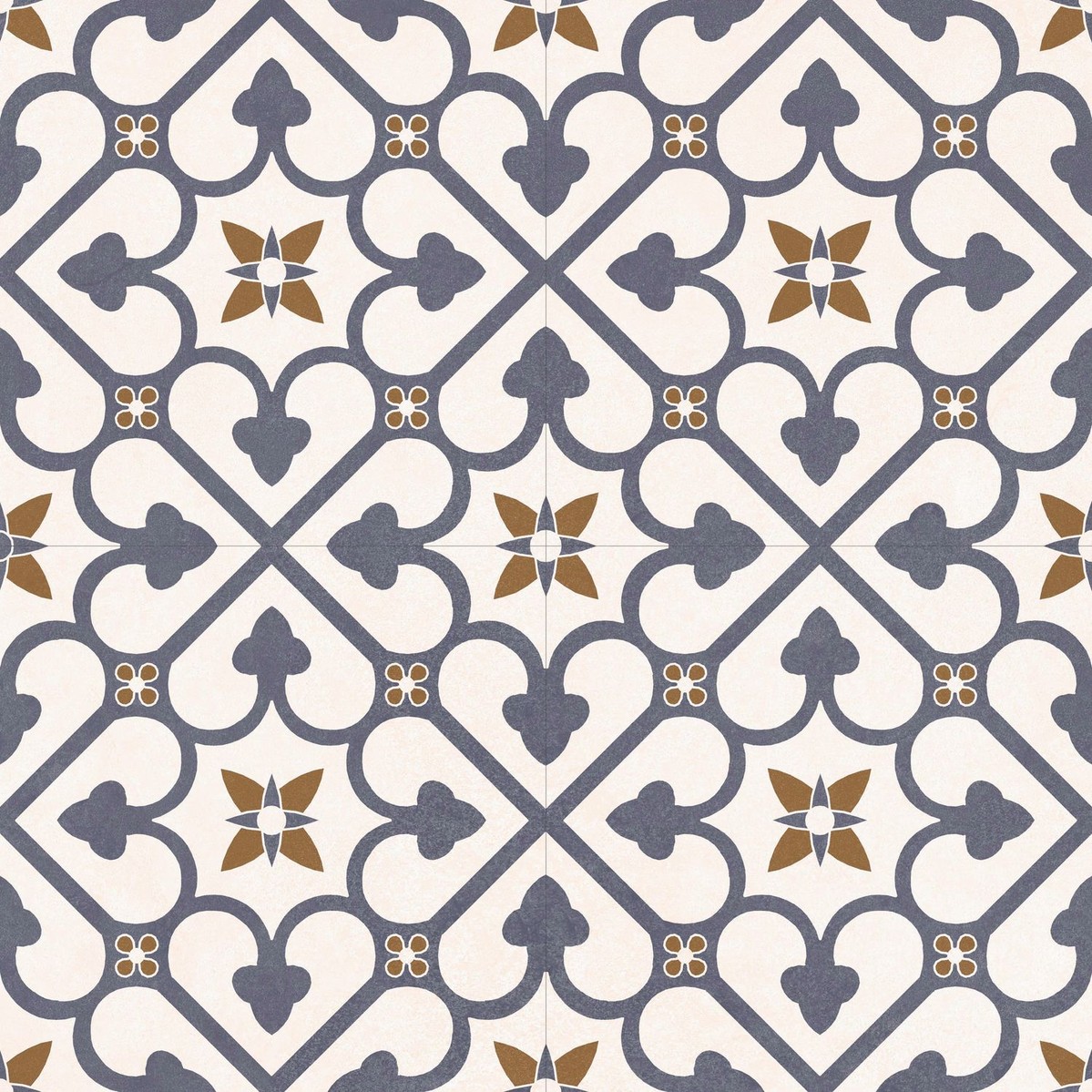 Brighton Blue 18×18 Glazed Porcelain Tile brings a different kind of texture: visual texture. The pattern adds rhythm, contrast and a little old-world charm that makes a room feel considered fast.