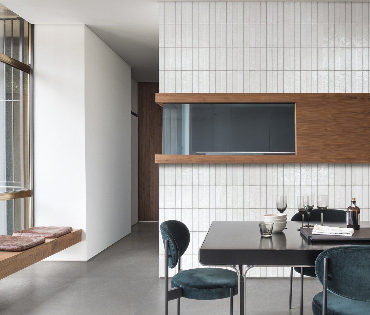 A smaller matte white tile gives the wall a softer, more relaxed feel.