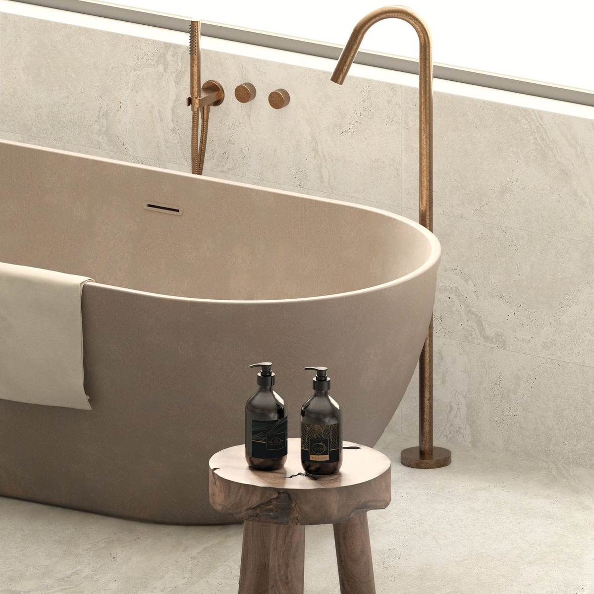 Soft stone-look texture keeps the space calm, layered and expensive-looking.