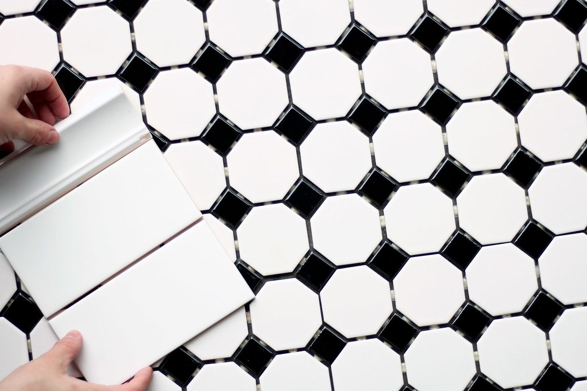 Tile shown: Retro Octagon Matte White With Black Dot 2×2 Ceramic Floor and Wall Tile